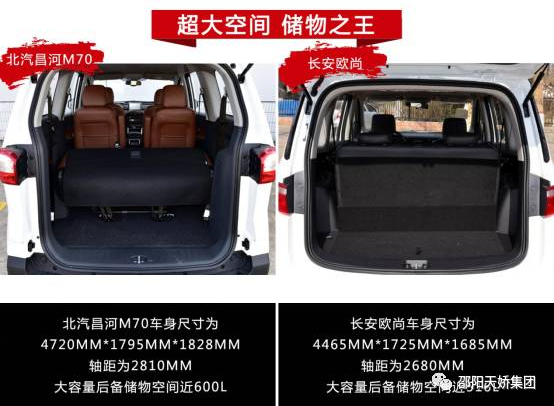 對于從旅行轎車演變而來的MPV來講,大空間是必備需求。而從數(shù)據(jù)來看,無論長、寬、高還是整體空間,乃至軸距,北汽昌河M70都比長安歐尚大了一圈。而折算下來,單后備儲物空間一項,北汽昌河M70的近600L空間就比長安歐尚的近516L大了84L。同為7座車,儲物能力更強,宜商宜家絕對沒話說