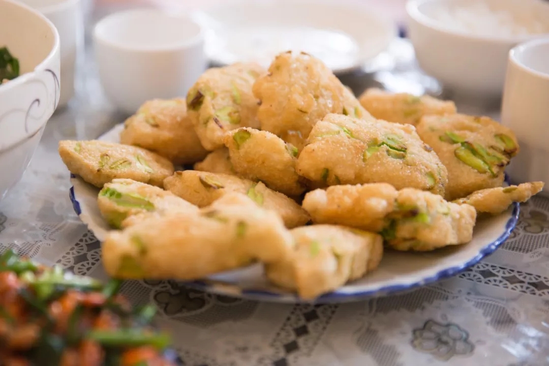 還有一道菜是我特別喜歡的,問向?qū)Т蟾缢牟嗣鞘裁?,答曰:“蠶豆包包”,是當?shù)厝说慕蟹?,模樣長得乖巧,名字也這么可愛呢。它更像是一道餐后小甜點,軟軟的糯米包裹著酥松的蠶豆入鍋炸,外酥里嫩,吃的時候蘸少許白糖,口感極佳。