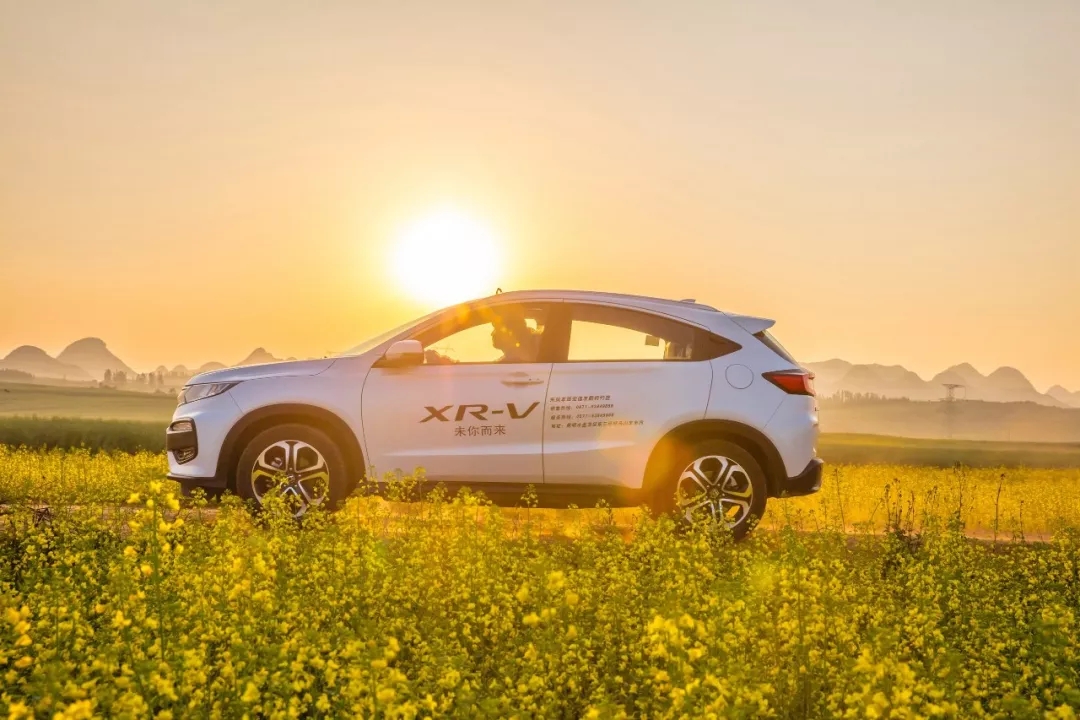 為了看日出,我們早早起床,再次一頭扎進金黃色的世界里。太陽從遠處連綿起伏的群山后緩緩升起,傾瀉而下的光將油菜花田襯托的更加金燦燦。XR-V從遠處駛來,車身也在日出之光的照耀下鍍上了一層金邊,金色的線條與棱角勾勒出了一副陽剛的面貌。