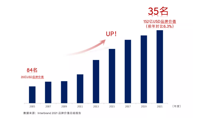 自2005年首次躋身Interbrand全球品牌100強榜單以來,現(xiàn)代汽車每年都與全球各大品牌并駕齊驅。如今,其品牌排名連年上升了49位,品牌價值大幅上漲了117億美元,實現(xiàn)了強勁增長(2005年品牌排名居于第84位,品牌價值為35億美元)。