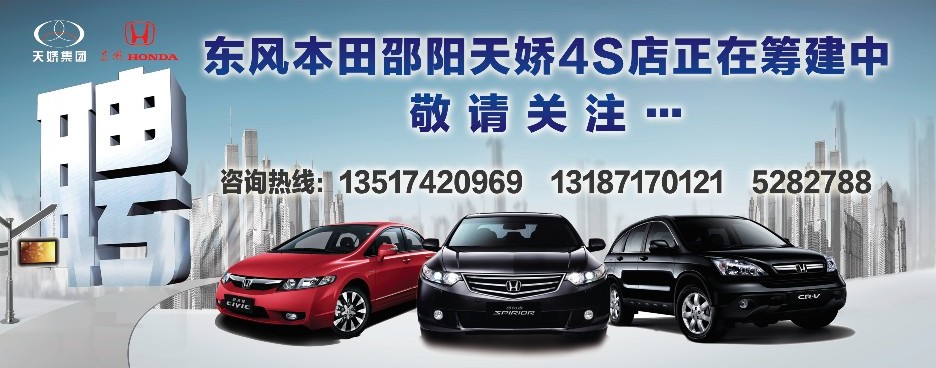 東風(fēng)本田邵陽天嬌4S店主要以汽車銷售服務(wù)為主,目前對人才的需求包括:銷售、售后、財會、管理等相關(guān)人才。